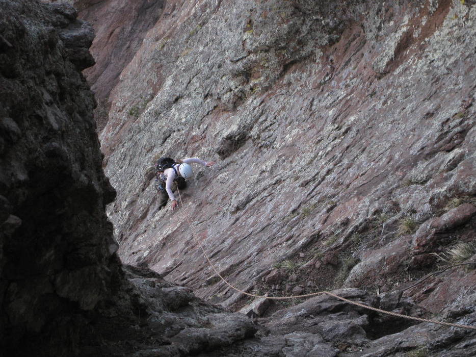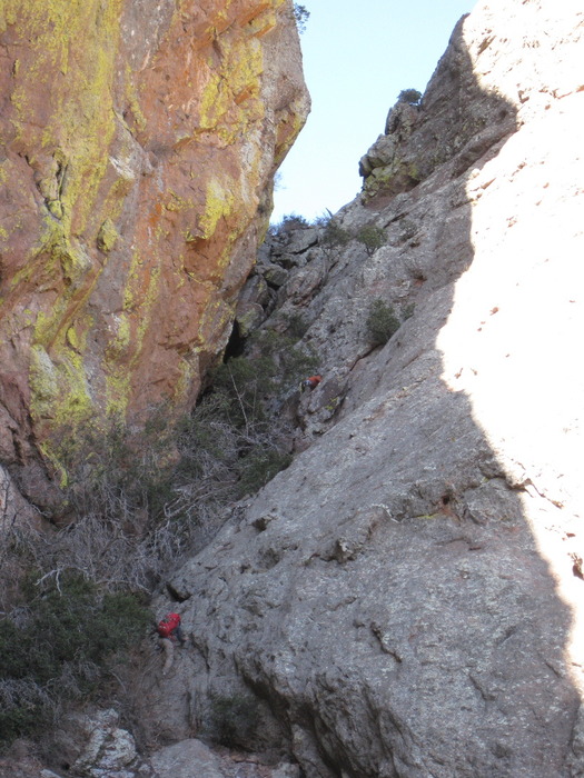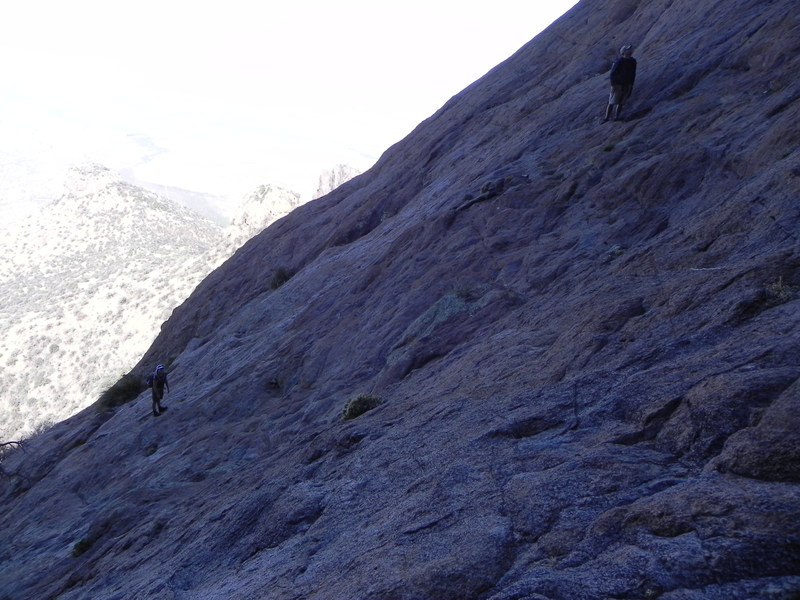 The easiest line from below angles slightly left, where there are good hand and footholds, usually just an inch deep, but very stable. The rock itself provides a lot of friction. Still, I had to think each step carefully, planning each foot placement, then where the hands would go. The first goal is a ledge about 25 feet up. Once there, I cleaned the first pro, then shimmied slightly right and started up the remainder, at which point the rock leans back ever so slightly. The next goal was a more substantial ledge, this one about two feet wide. I took off the second pro, and just willed my ass up that slope. By now, I was near an exit ramp, a class-3 chute with giant hand and footholds. I followed that up and onto a ledge, untied myself, and handed the rope back to Kelley so he could throw it down to Peavy for his turn. (Source)