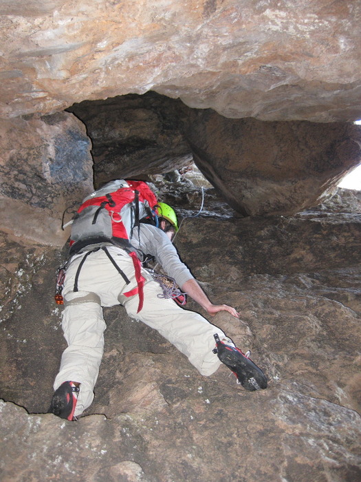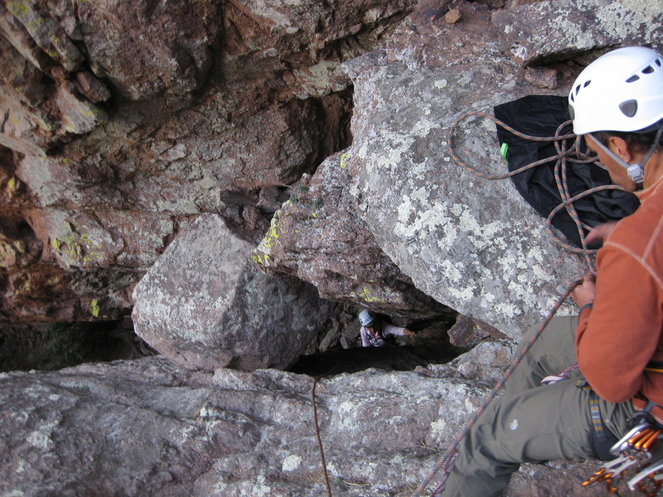 Climb up through a crack, passing under a large bolder. This is about class 4.