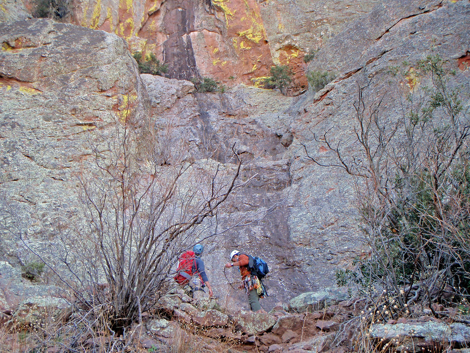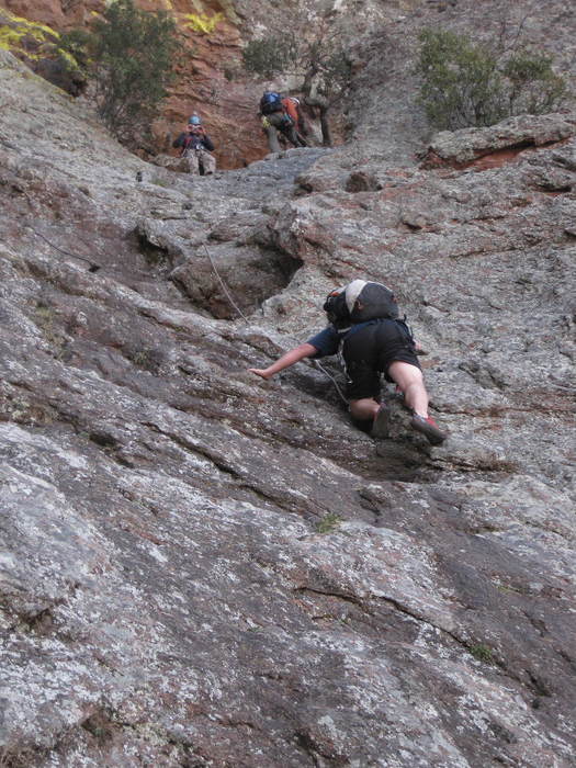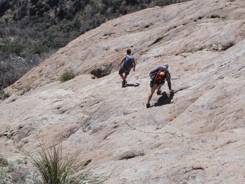 The ramp leads into a use trail through trees and brush and eventually to the legendary class 4 wall. You know you are at the right place because more rusty bent pipes are sticking out of the wall about 80 feet above. A ladder had been built over this section as well. The small oak tree used as a belay point at the top of the wall is also fairly obvious. After a little study, we could also see hangers in the rock. I got on my rock shoes and started up dragging the rope. The rock here was more solid and fun than on Weavers Needle. Similar to Weavers Needle, the crux of the climb is the first 20-30 feet, although Baboquivari’s class 4 wall is easier.